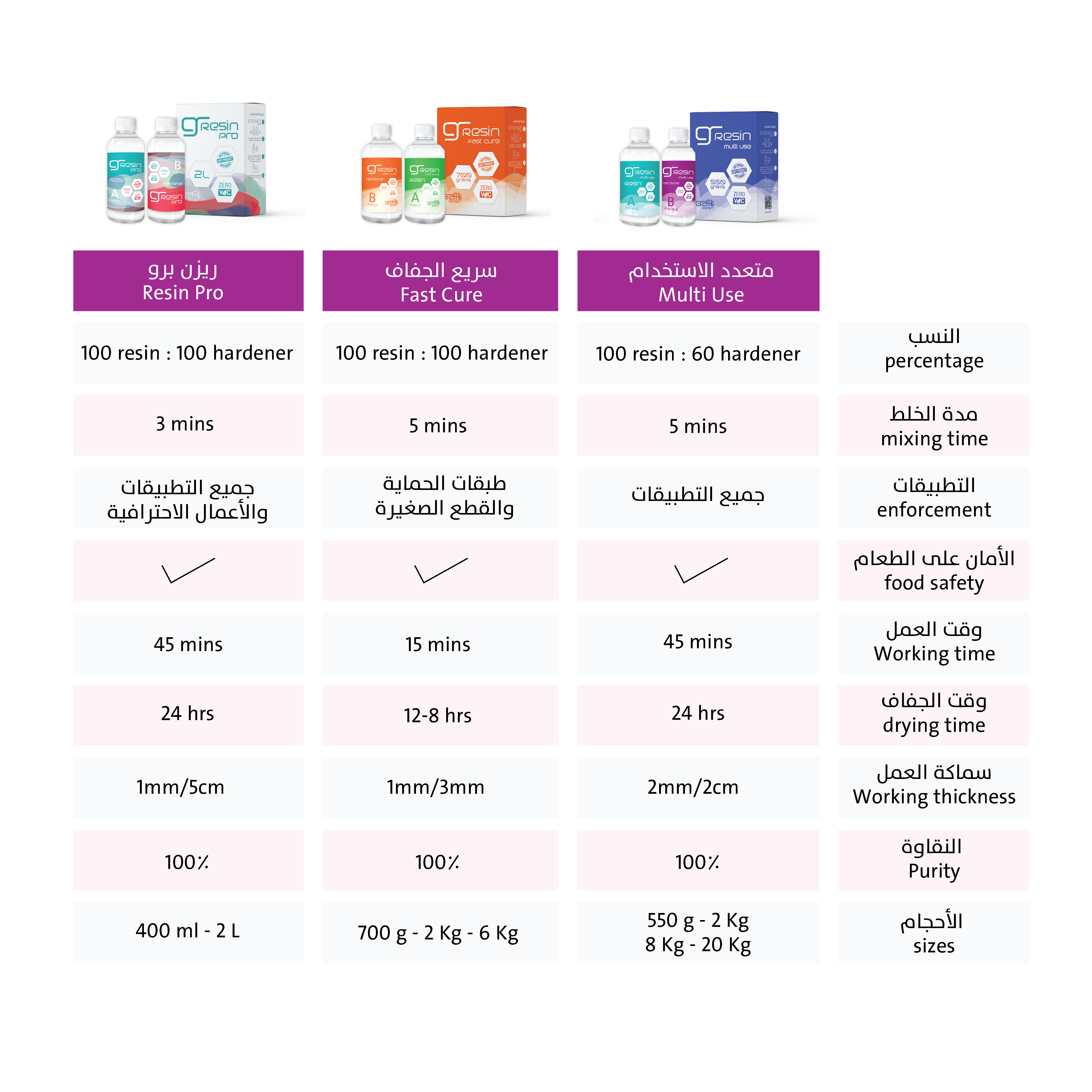 تقدم Graffiti Resin ثلاثة أنواع مختلفة من الريزن: Resin Pro و Resin Multi-Use و Resin Fast-cure. كل نوع من الريزن له خصائصه الفريدة التي تجعله مثاليًا لتطبيقات معينة. دعونا نلقي نظرة عن كثب على كل من هذه المواد وما الذي يجعلها مميزة للغاية.